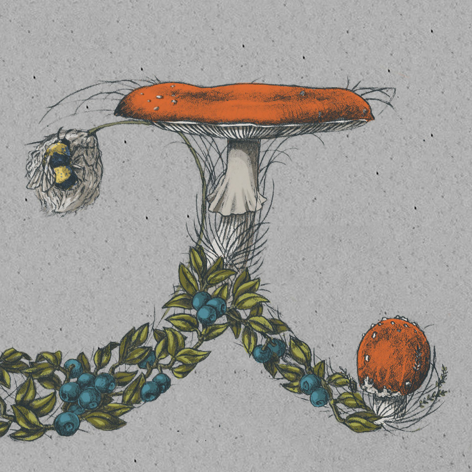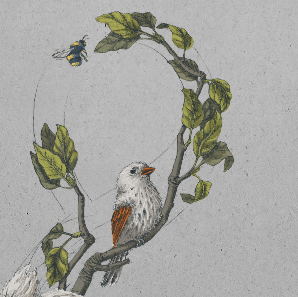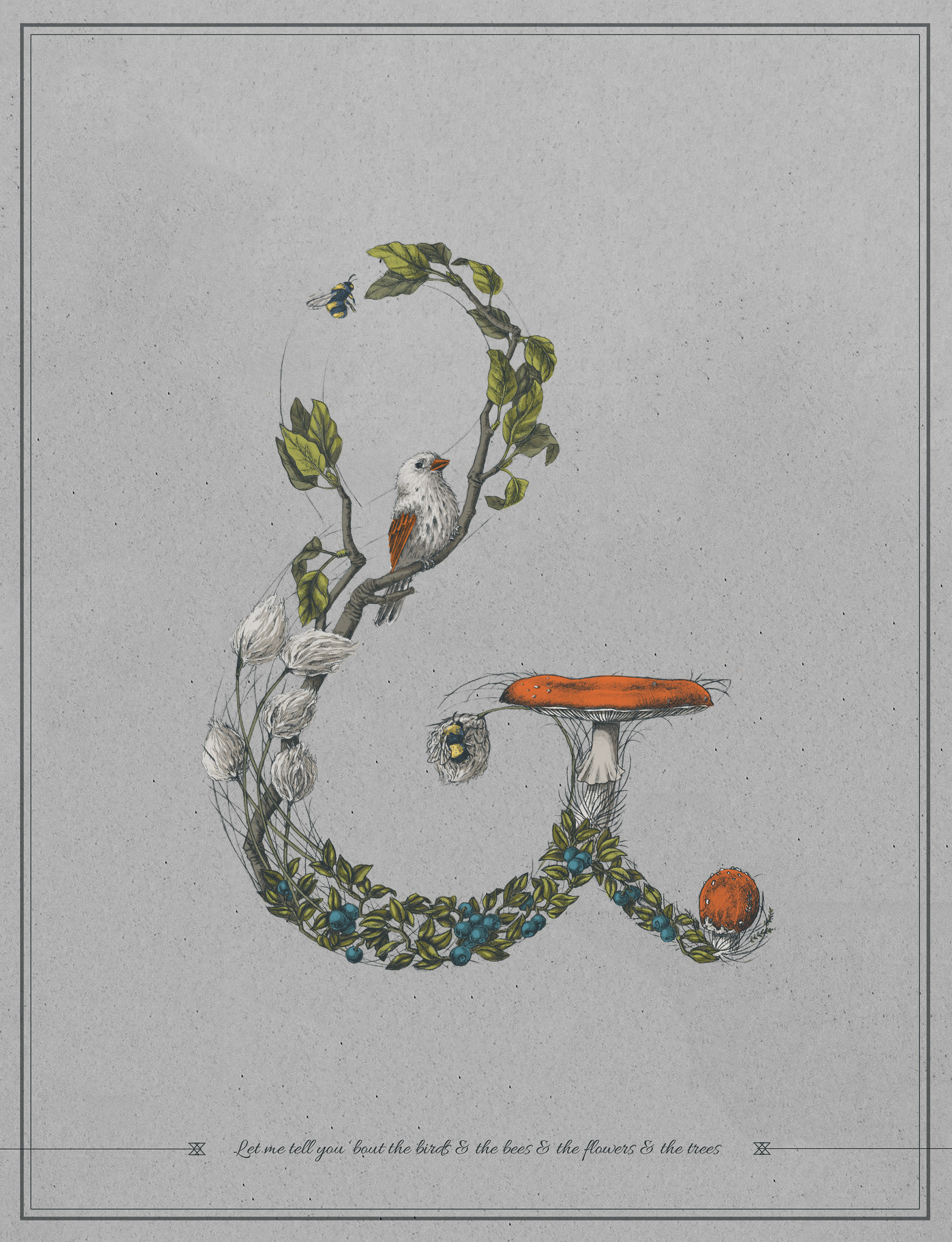 Birds and bees and flowers and trees within the shape of an ampersand.